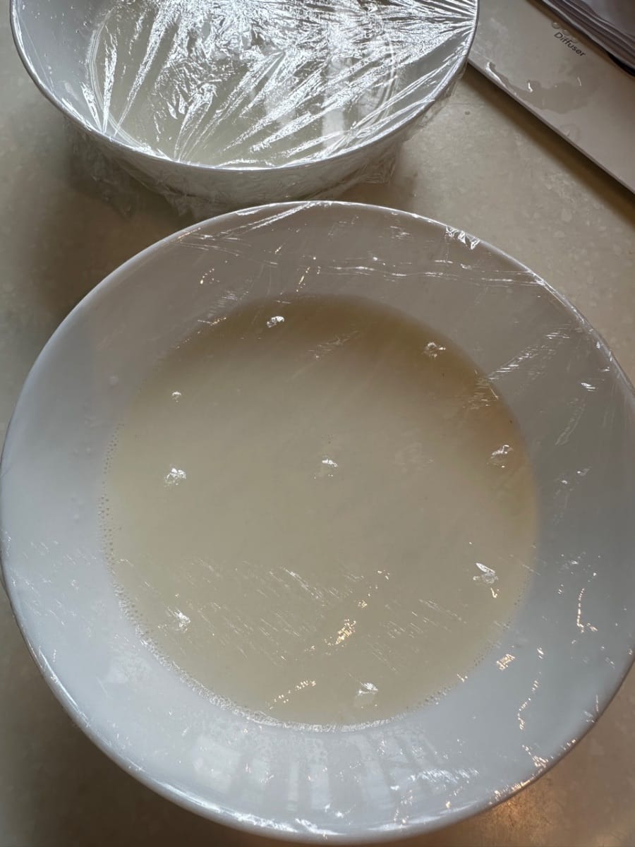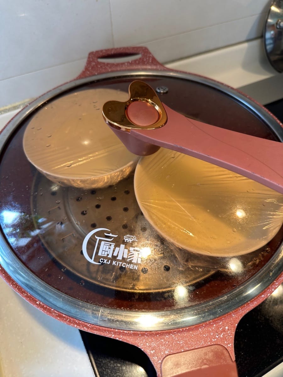 - Die Schüsseln mit Frischhaltefolie umwickeln und einige Löcher zum Dämpfen hineinstechen.
