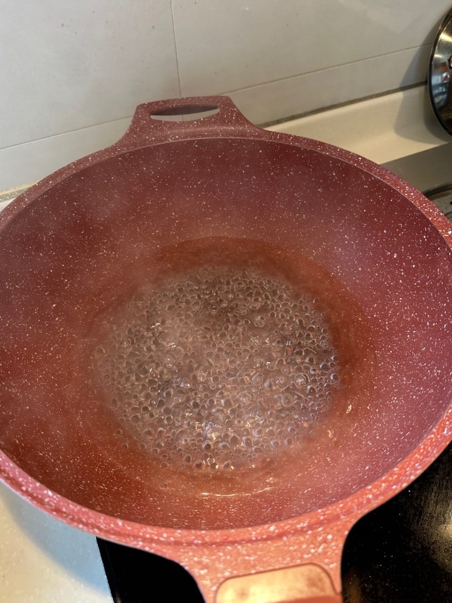 - Bei schwacher Hitze auf dem Herd erhitzen, bis sich der Zucker aufgelöst hat.