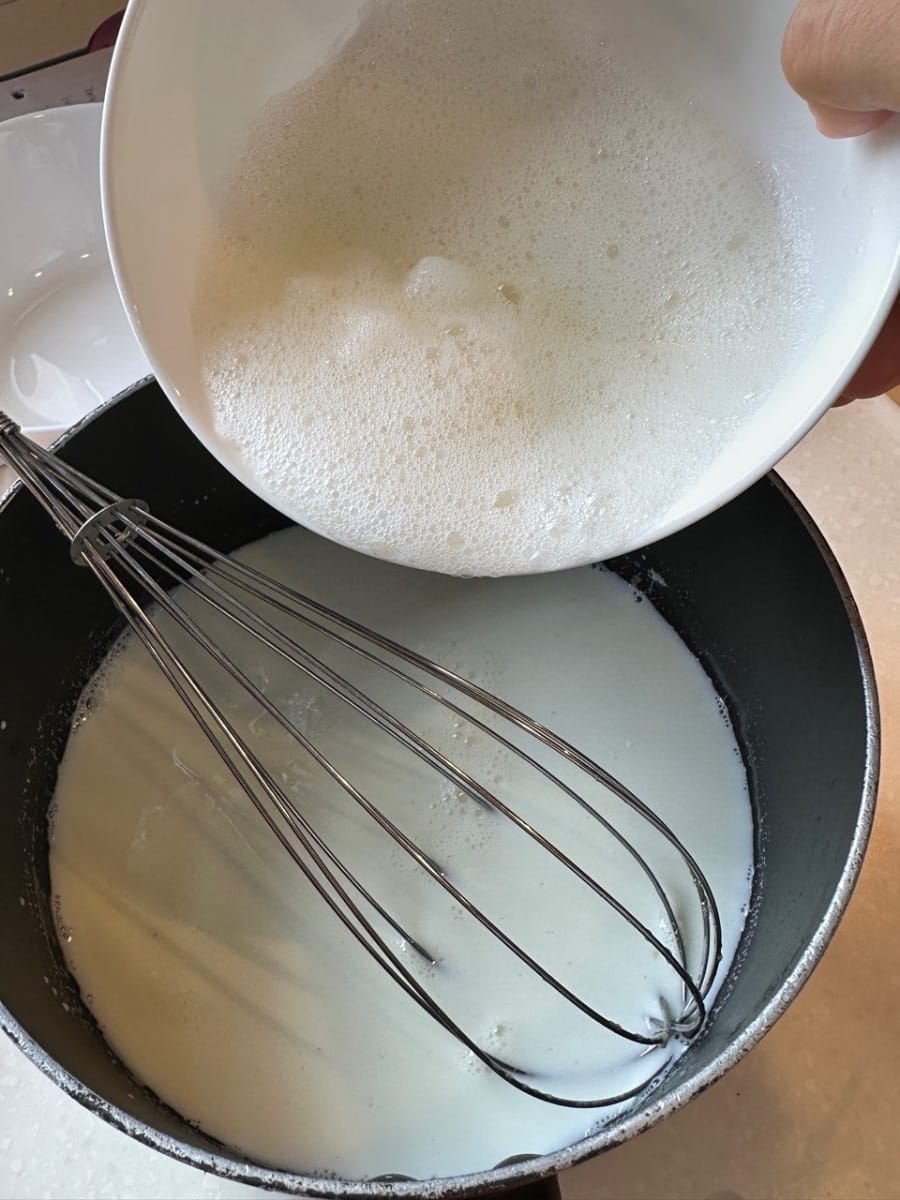 - Anschließend das Eiweiß unter ständigem Rühren in die abgekühlte Milch geben.