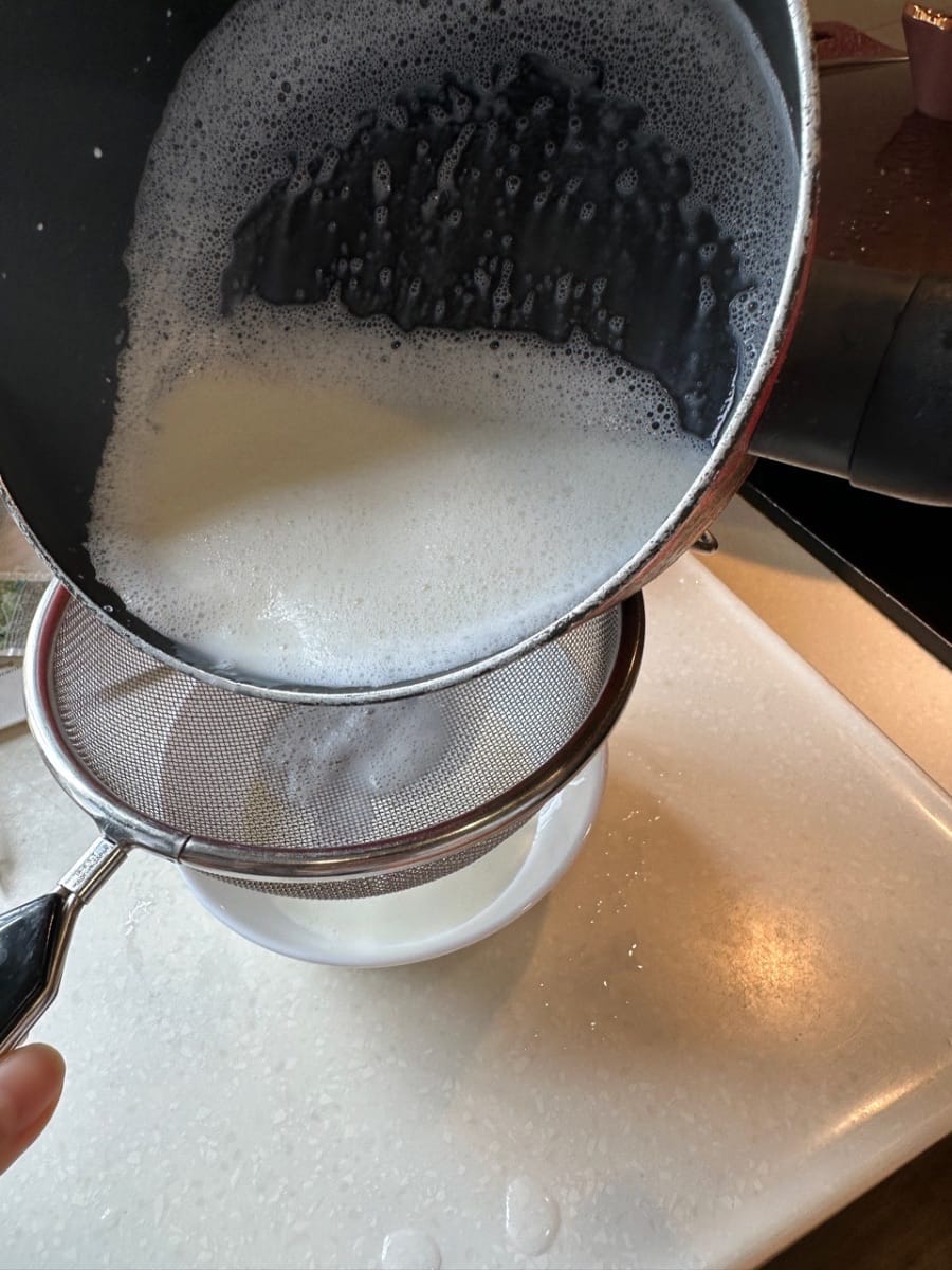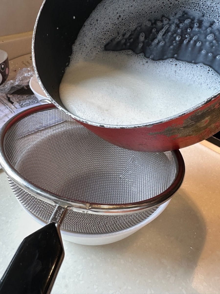 - Anschließend die Mischung durch ein Sieb gießen, um große Luftblasen zu entfernen.