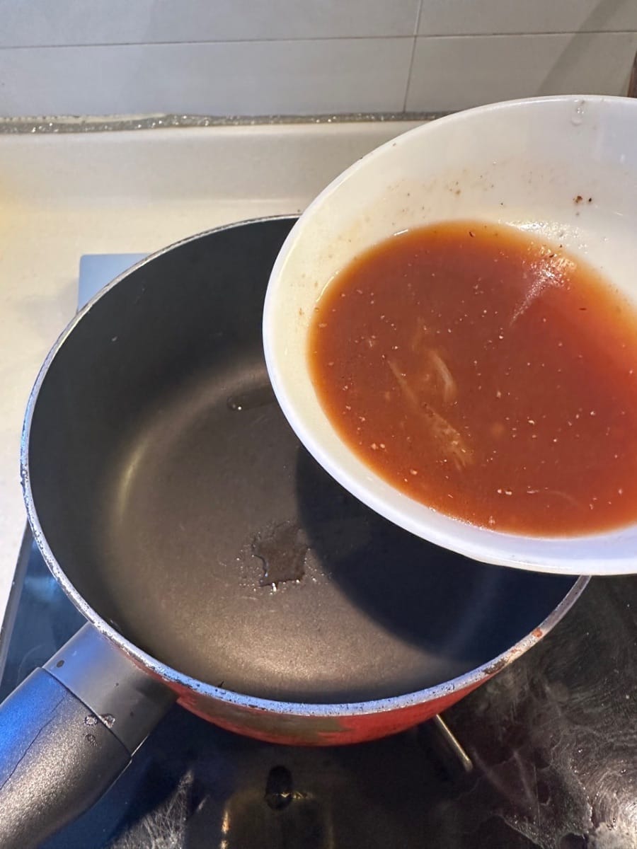- Die Sauce zugedeckt bei starker Hitze einkochen lassen, dann Sesamöl für das Aroma hinzufügen.