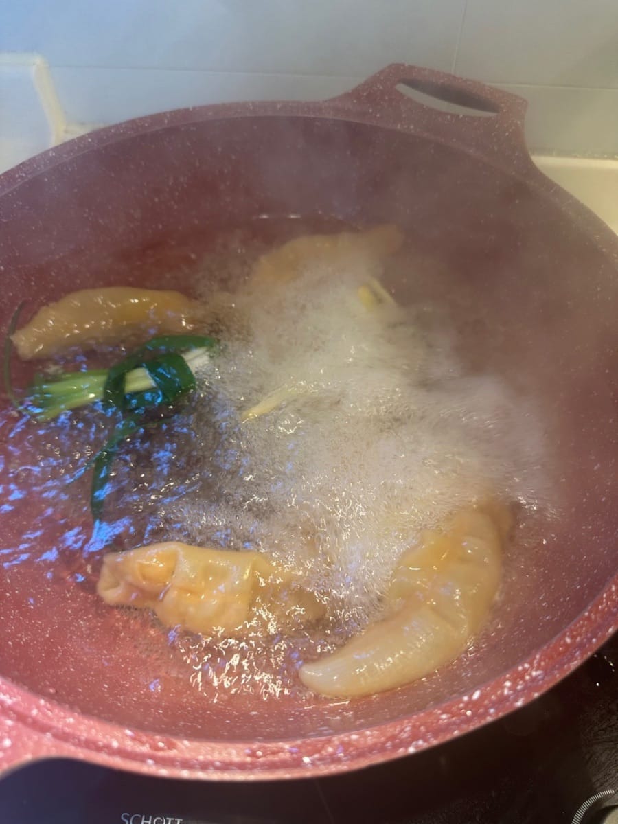 - Die Fischblase mit Ingwer, Frühlingszwiebeln und Kochwein 10 Minuten blanchieren. Anschließend sofort mit kaltem Wasser abspülen.