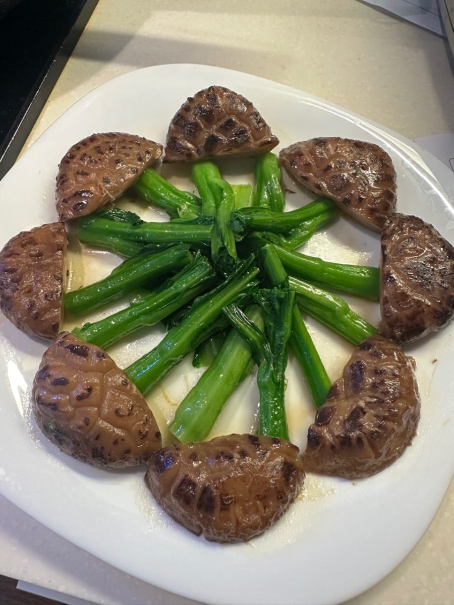 Geschmorte Fischblase mit Pilzen. Die Sauce ist dickflüssig, aber nicht fettig und umhüllt die Zutaten perfekt. Die Zartheit der Fischblase, der Biss der Pilze und der Umami-Geschmack der Sauce ergeben Schicht für Schicht ein reichhaltiges und dennoch harmonisches Geschmacksprofil. Dies ist ein klassisches Beispiel für die „perfekte Balance“ kantonesischer Schmorgerichte.