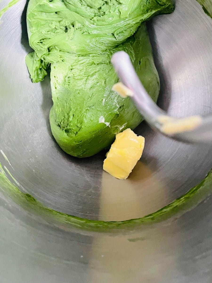 - Butter hinzufügen (in einem separaten Schritt): Die weiche Butter in kleine Stücke schneiden und bei niedriger Geschwindigkeit etwa 3 Minuten lang kneten, damit die Butter langsam in den Teig eingearbeitet wird und dieser nicht an den Seiten der Schüssel kleben bleibt.