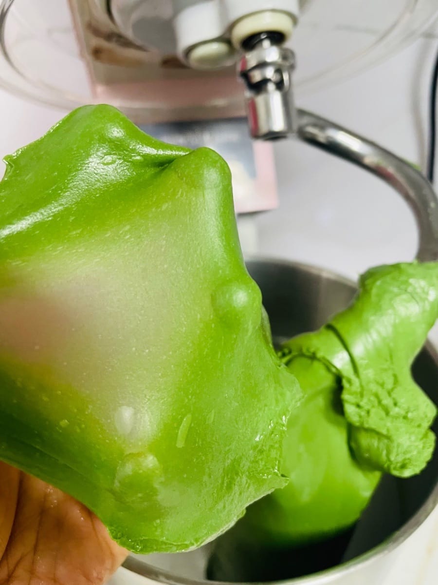 8 Minuten bei mittlerer bis hoher Geschwindigkeit kneten, bis sich der Teig zu einer dicken, handschuhförmigen Membran mit glatten Rändern ausziehen lässt.