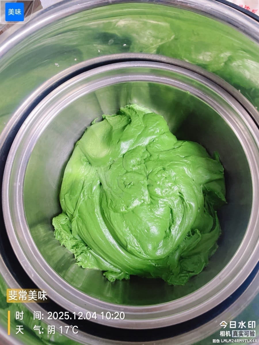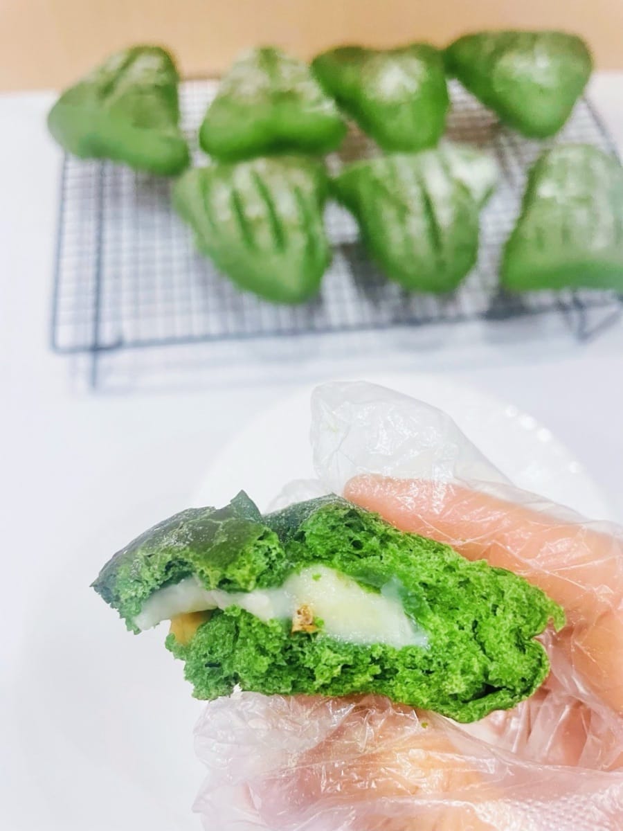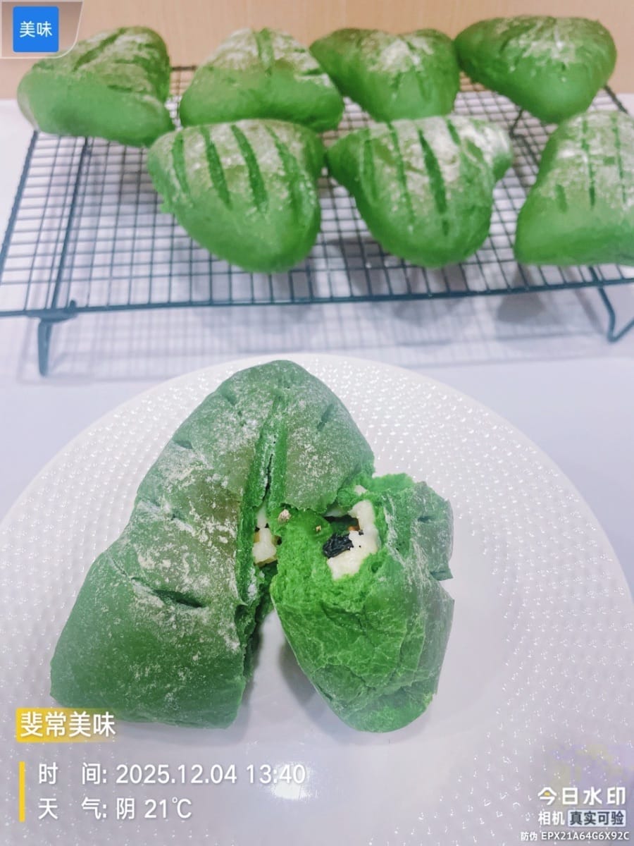 Dieses leuchtende „Frühlingsgrün“ hebt die Atmosphäre sofort, sobald es auf dem Tisch steht! Das weiche Matcha-Brot nach europäischer Art hat eine knusprige, aber dennoch zarte Kruste und ist innen mit einer Mochi-Füllung aus Nüssen gefüllt – cremig-zart dank Frischkäse. Selbst abgekühlt ist es noch elastisch und zart. Der Duft von Tee und Milch vermischt sich und verwöhnt die Geschmacksknospen. Es ist so weich, als hielte man die Süße des Frühlings in den Händen!