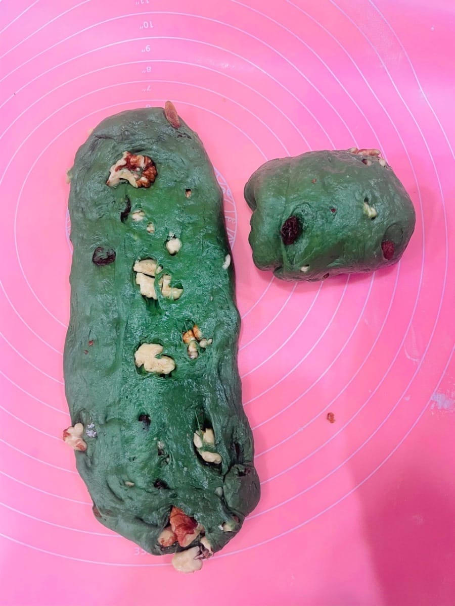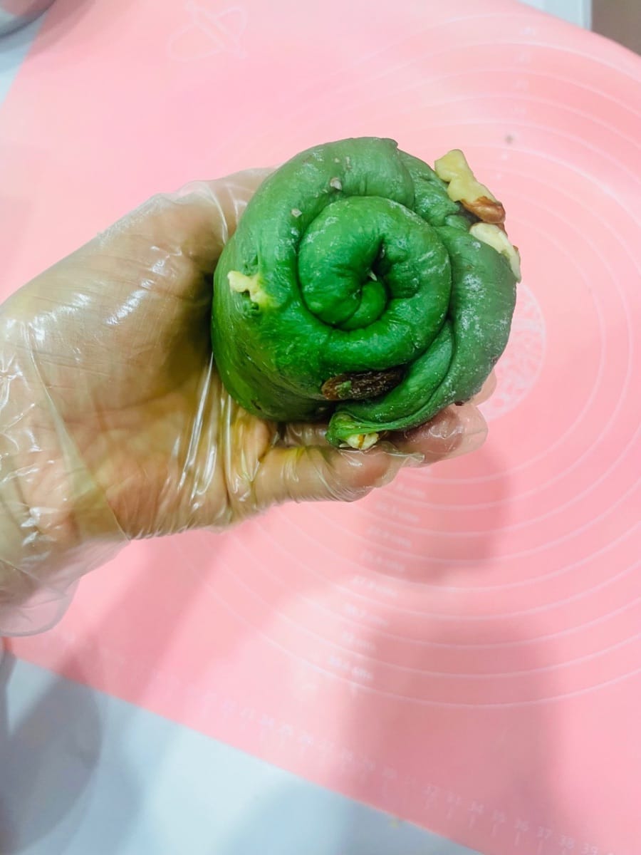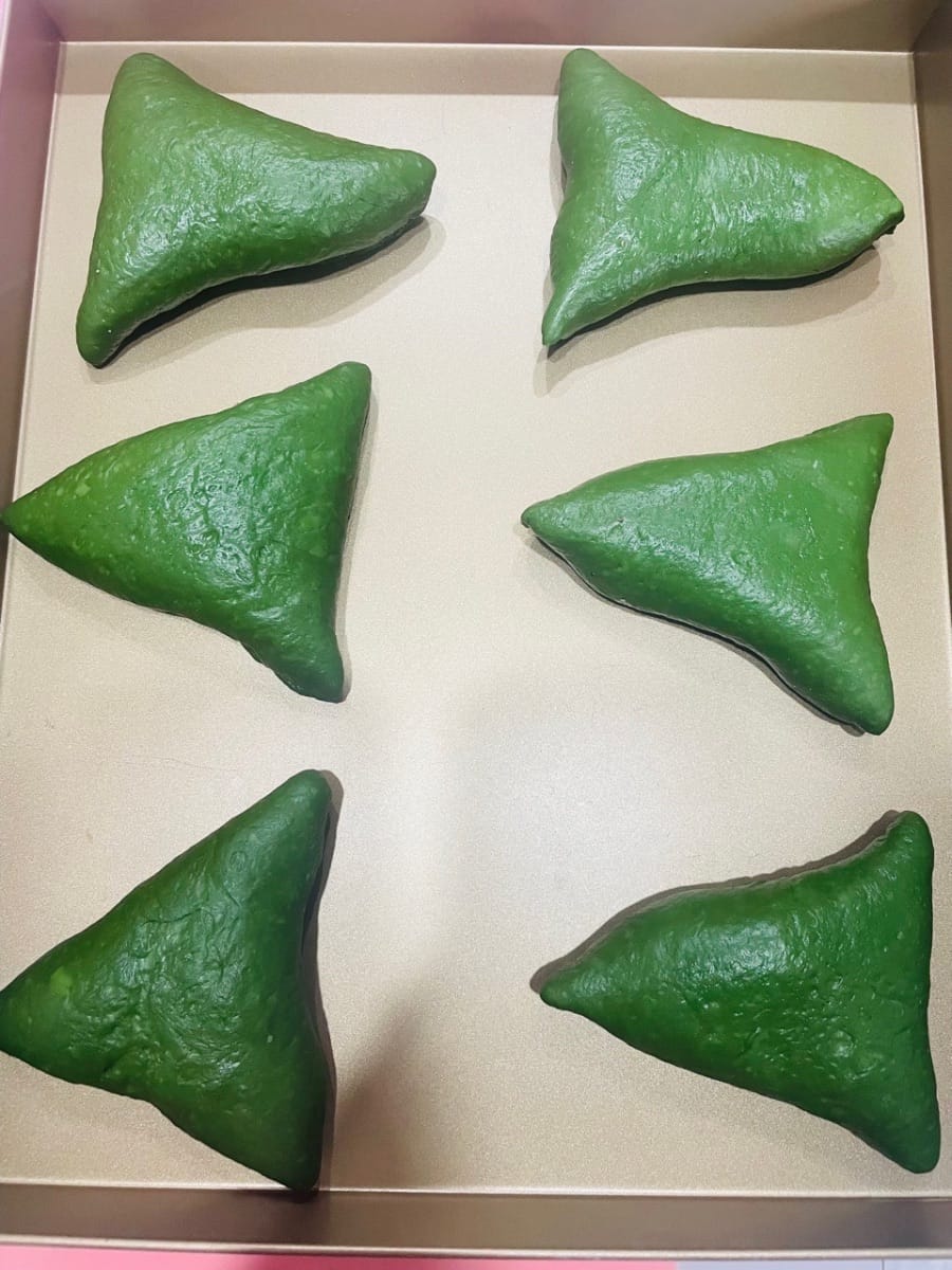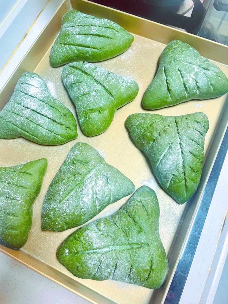 Dieses leuchtende „Frühlingsgrün“ hebt die Atmosphäre sofort, sobald es auf dem Tisch steht! Das weiche Matcha-Brot nach europäischer Art hat eine knusprige, aber dennoch zarte Kruste und ist innen mit einer Mochi-Füllung aus Nüssen gefüllt – cremig-zart dank Frischkäse. Selbst abgekühlt ist es noch elastisch und zart. Der Duft von Tee und Milch vermischt sich und verwöhnt die Geschmacksknospen. Es ist so weich, als hielte man die Süße des Frühlings in den Händen!
