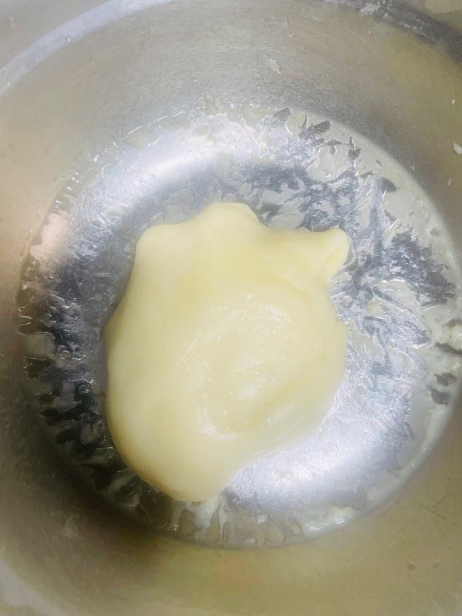 - Nach dem Abkühlen Butter und glatten Frischkäse hinzufügen und gut verkneten, bis alles gut vermischt ist.