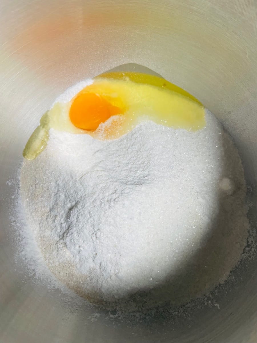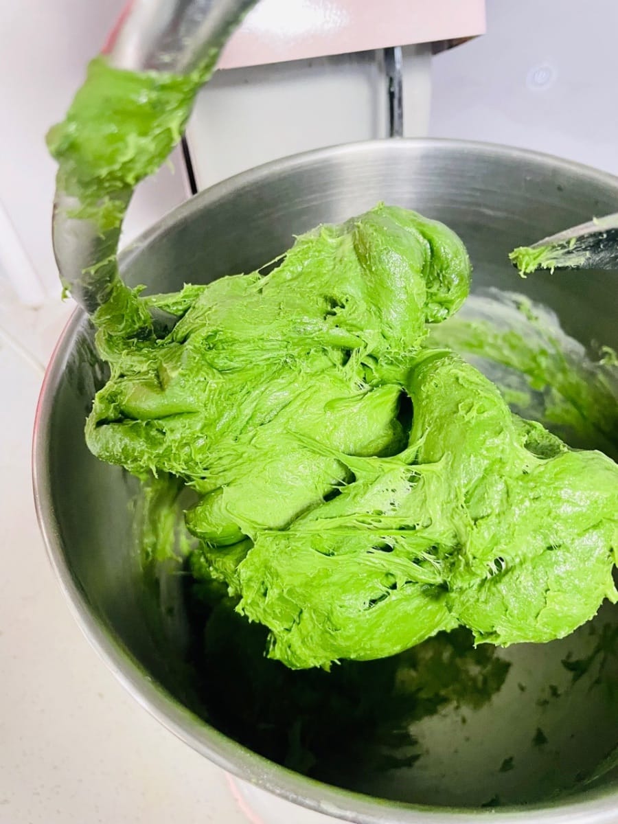 - Zutaten vorbereiten + mischen (erster Schritt: alle Zutaten abwiegen): Alle Zutaten, einschließlich Weizenmehl mit hohem Glutengehalt, Matcha-Pulver, Kristallzucker, Salz, Hefe, Milch und Eiklar, in die Rührschüssel geben (Butter noch nicht hinzufügen).