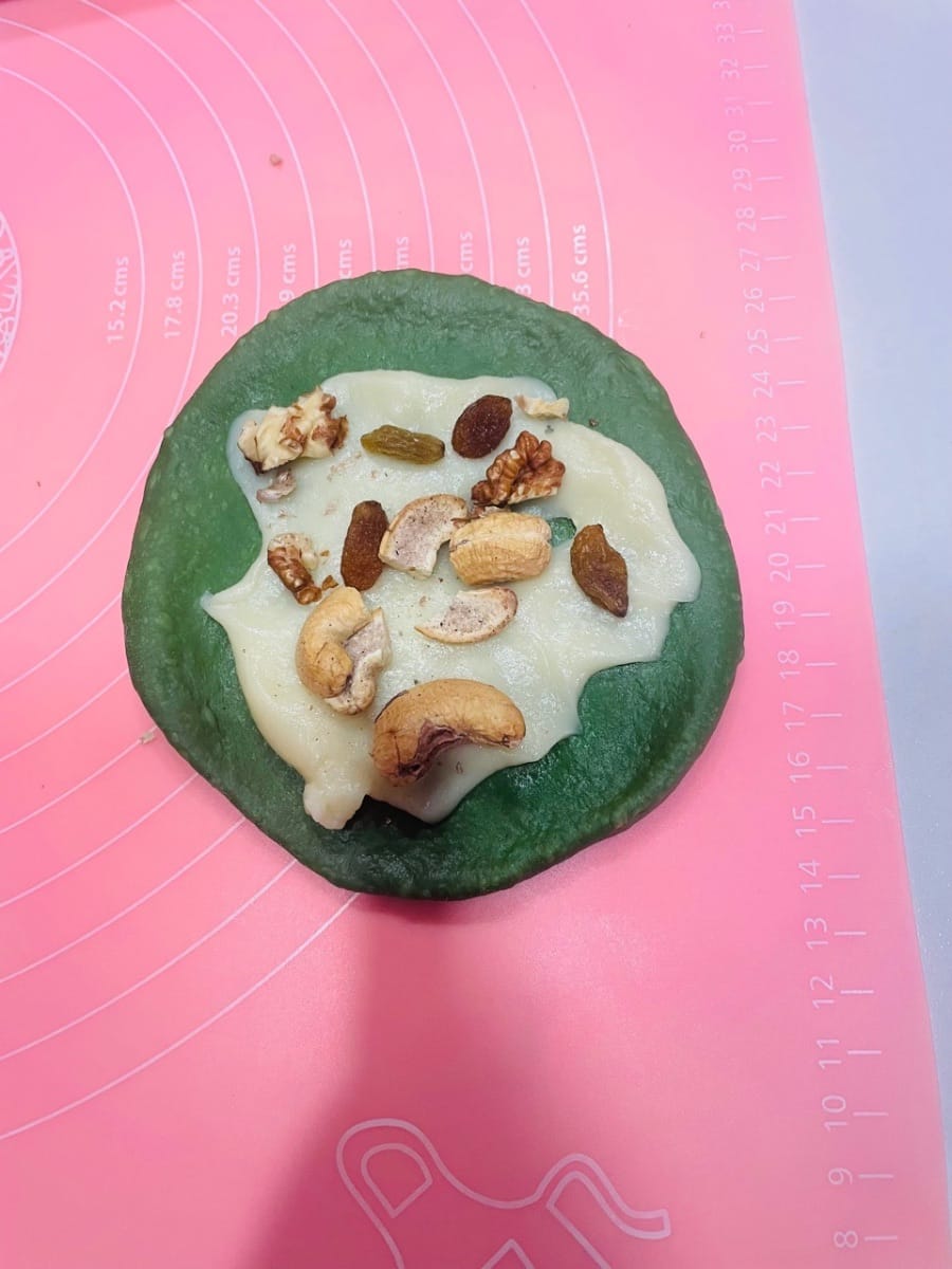 - (2) Füllen und Formen: Nehmen Sie einen lockeren Teigball, drücken Sie ihn mit der Handfläche flach und rollen Sie ihn zu einem Kreis aus. Geben Sie die Mochi-Füllung und die gehackten Nüsse in die Mitte und drücken Sie die Öffnung von einem Ende zur Mitte hin fest zusammen (drücken Sie mehrmals, damit die Füllung beim Backen nicht ausläuft). Alternativ können Sie den Teig auch nach Belieben formen.