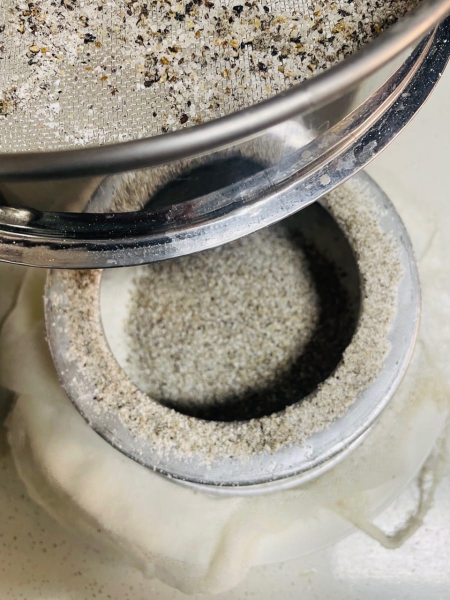 2. Die Mischung aus schwarzem und weißem Sesampulver zusammen sieben und als zweite Schicht verwenden.