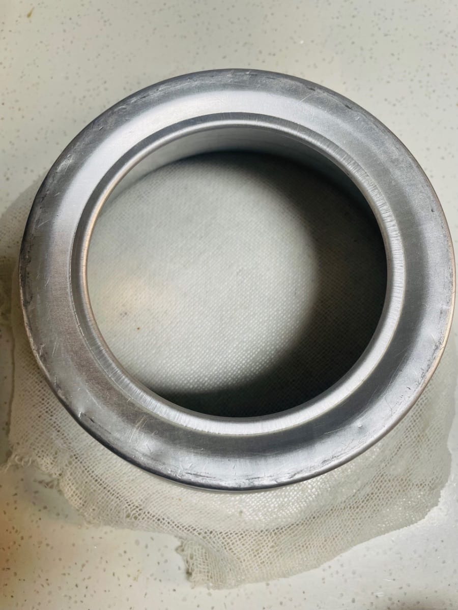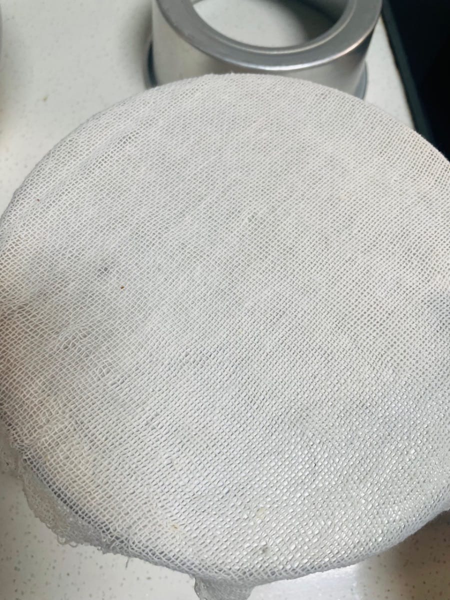 - Den Boden der Form mit einer Schicht Gaze auslegen, dann die Form daraufsetzen (Sie können einen Mousse-Ring oder eine Springform verwenden, nehmen Sie einfach, was Sie zu Hause haben).