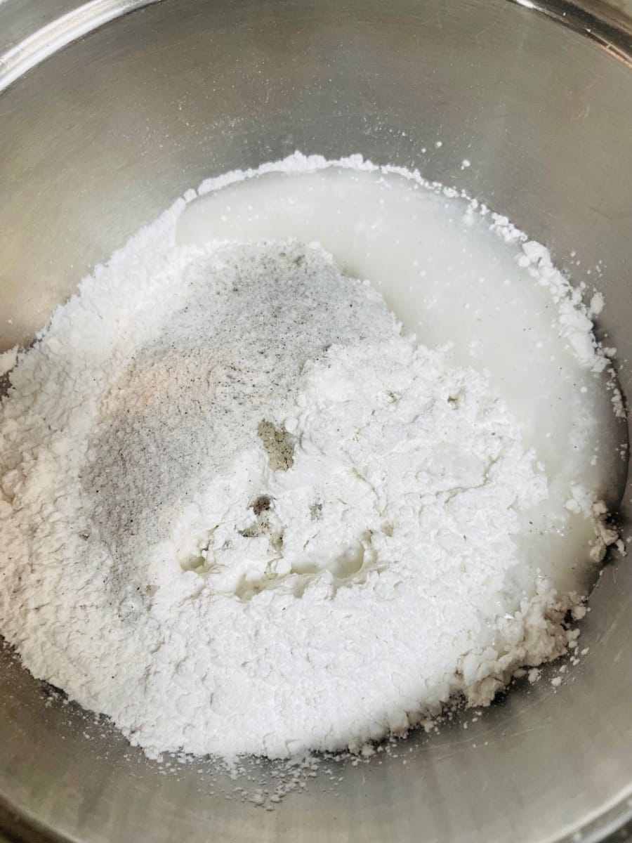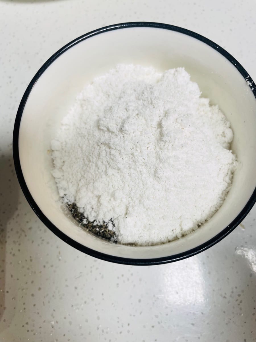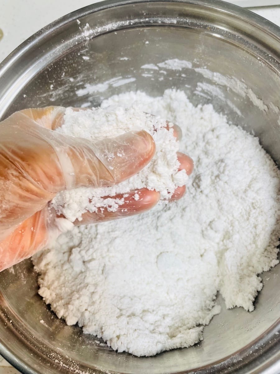 - Reismehl und Klebreismehl in einen Behälter geben, Puderzucker hinzufügen (mein Puderzucker war durch schwarzes Sesampulver "schwarz gefärbt", das war wohl ein kleiner Fehler~), dann 95 g Wasser dazugeben und gut umrühren.