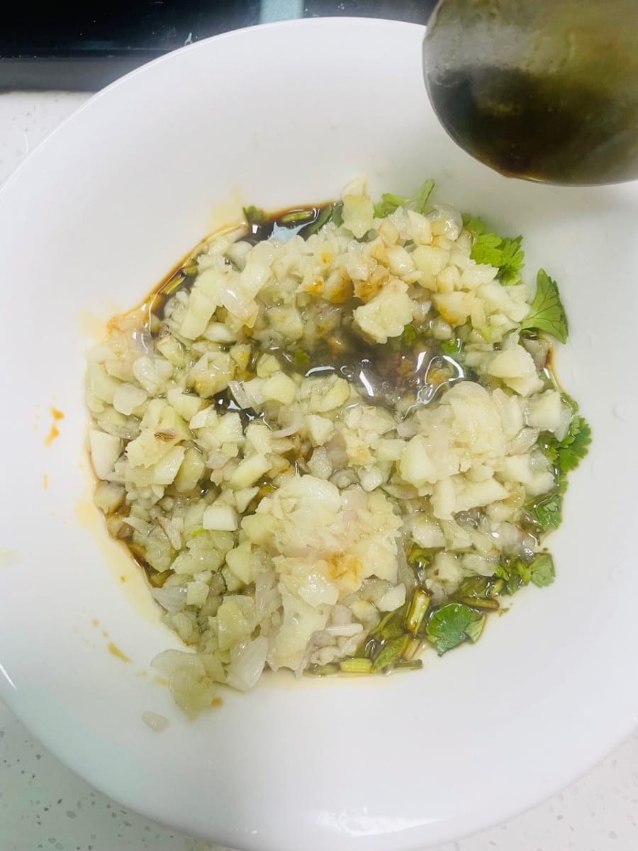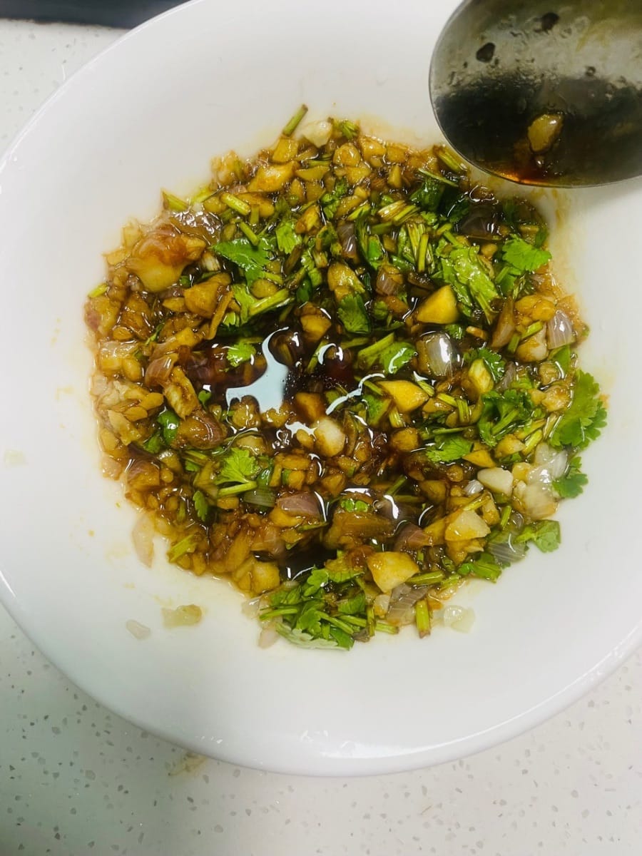 - 3. Öl in einer Pfanne erhitzen und die gehackten Schalotten und den Ingwer bei schwacher Hitze anbraten, bis sie duften. Die Sauce in eine Schüssel mit Sojasauce und Koriander geben und gut verrühren.