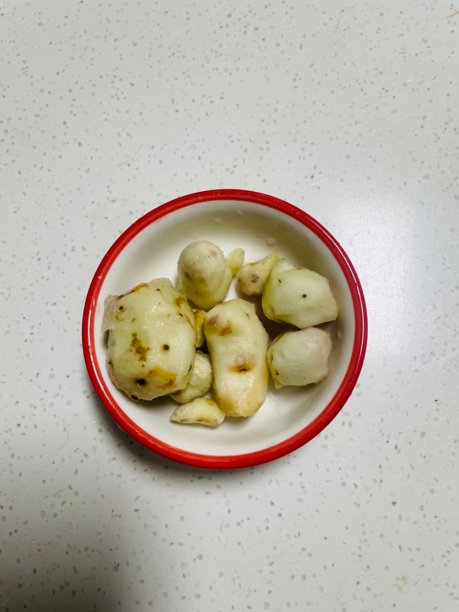 - Einen Teil des Sandingwers in Scheiben schneiden und den Rest fein hacken; die Schalotten ebenfalls fein hacken; ich habe die Chilischoten gehackt, aber da mein Kind kein scharfes Essen isst, habe ich sie nicht hinzugefügt.