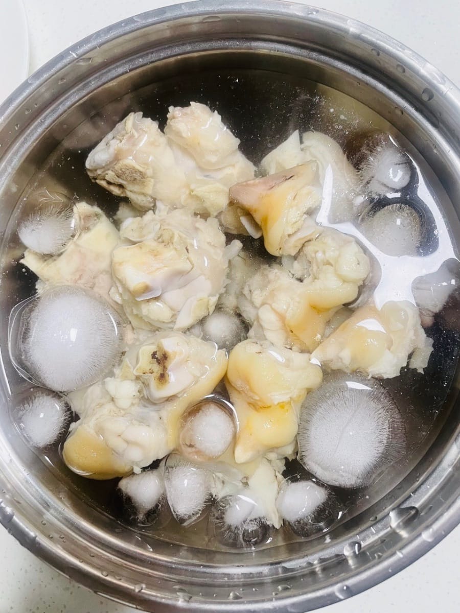 - Die gekochten Schweinsfüße herausnehmen, kurz abspülen und in abgekochtem, kaltem Wasser mit Eiswürfeln einlegen. Nach dem Einlegen sind sie besonders knusprig.