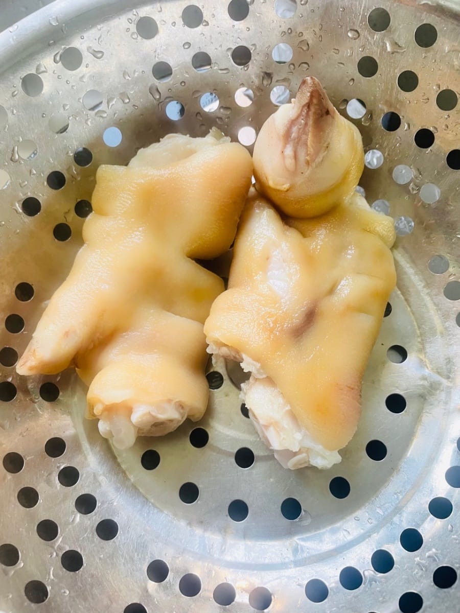 - In einem separaten Topf ausreichend Wasser, einen Löffel Salz, geschnittenen Ingwer und zwei Esslöffel Kochwein geben. Die Schweinsfüße hinzufügen und nach dem Aufkochen des Wassers 35 Minuten bei schwacher Hitze köcheln lassen.