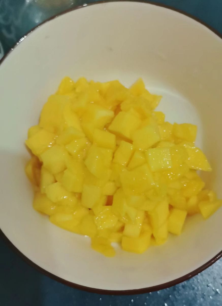 - Den größten Teil davon mit Milch in einen Mixer geben und zu einem schön gefärbten Mango-Smoothie pürieren.