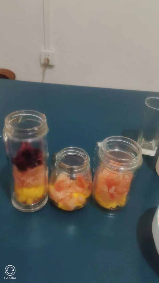 - Los geht's mit dem Zusammensetzen! Zuerst eine Schicht Mangostücke auf den Boden geben, dann eine Schicht Grapefruit hinzufügen und die untere Hälfte der Flasche mit Milch füllen, um das Fruchtfleisch zu halten.
