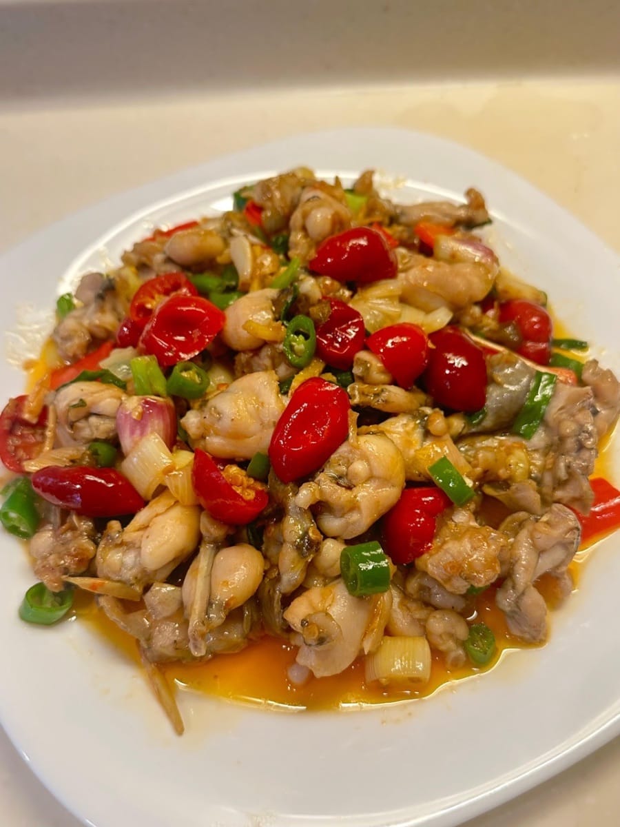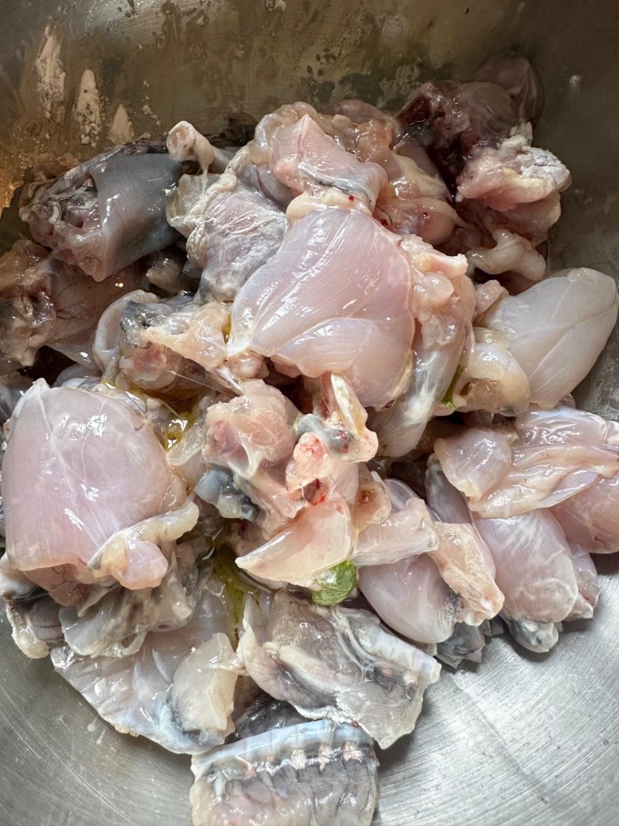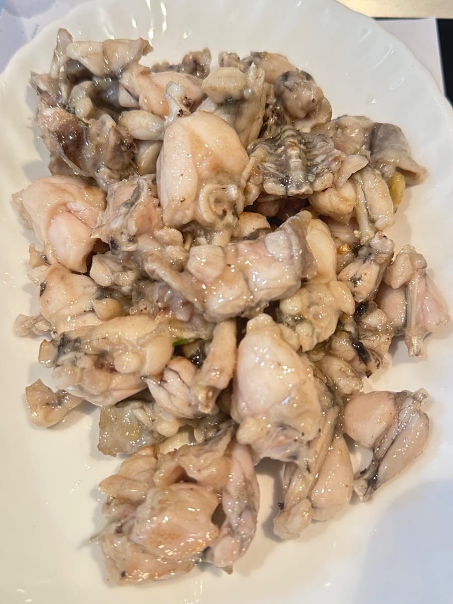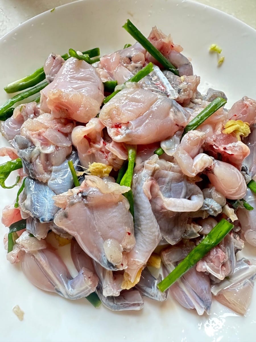 Anschließend Ingwer und Frühlingszwiebeln von den Ochsenfröschen entfernen und diese mit den benötigten Gewürzen ein zweites Mal marinieren. Beiseite stellen.