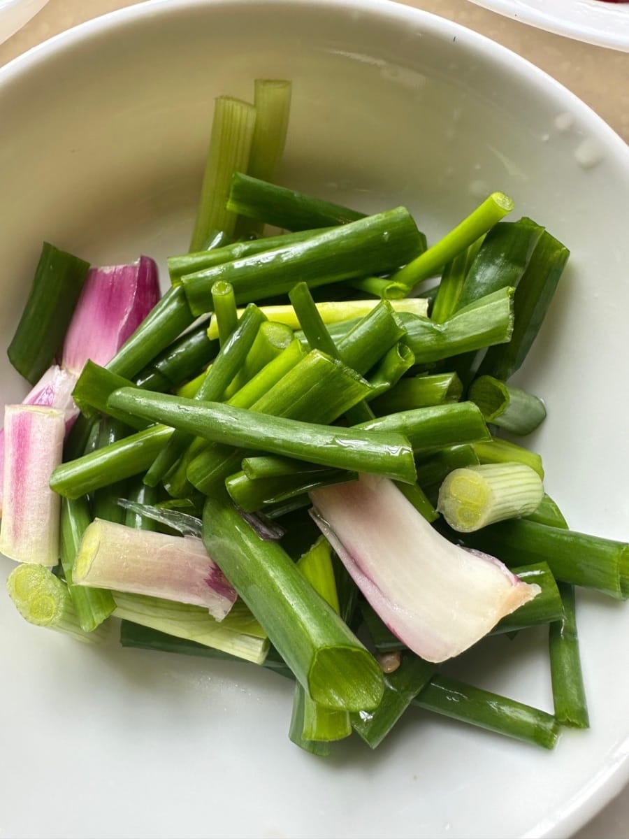 Zum Schluss die Frühlingszwiebeln dazugeben und unter Rühren anbraten, bis alles gut vermischt ist.
