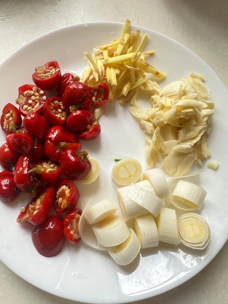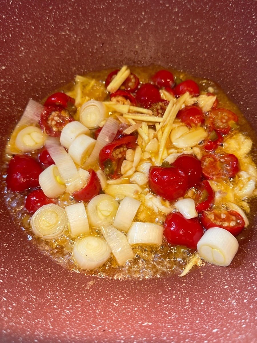 Anschließend in derselben Pfanne die eingelegten Chilischoten, den Lauch, den Knoblauch und den Ingwer hinzufügen. Unter Rühren anbraten, bis es duftet.