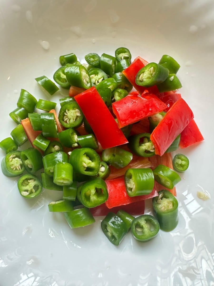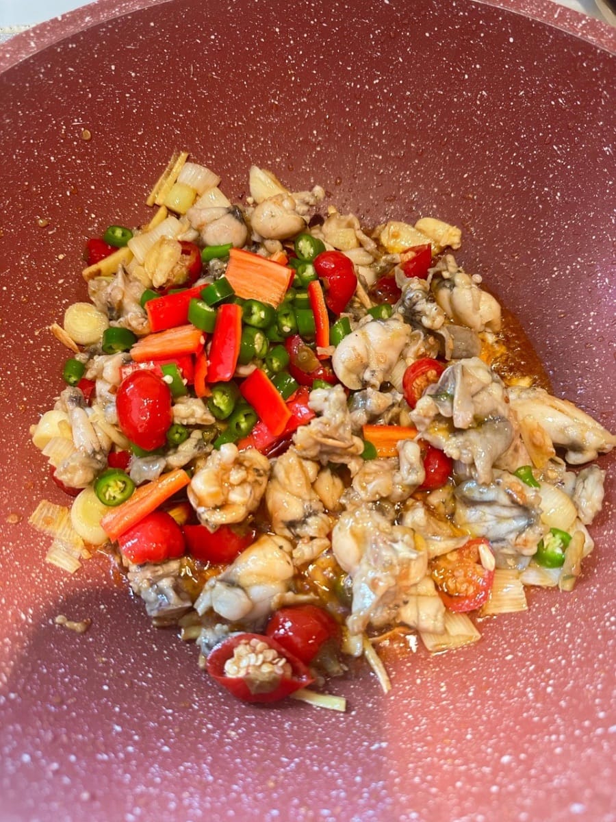 Anschließend rote und grüne Chilischoten hinzufügen. Außerdem Salz und Austernsauce dazugeben.