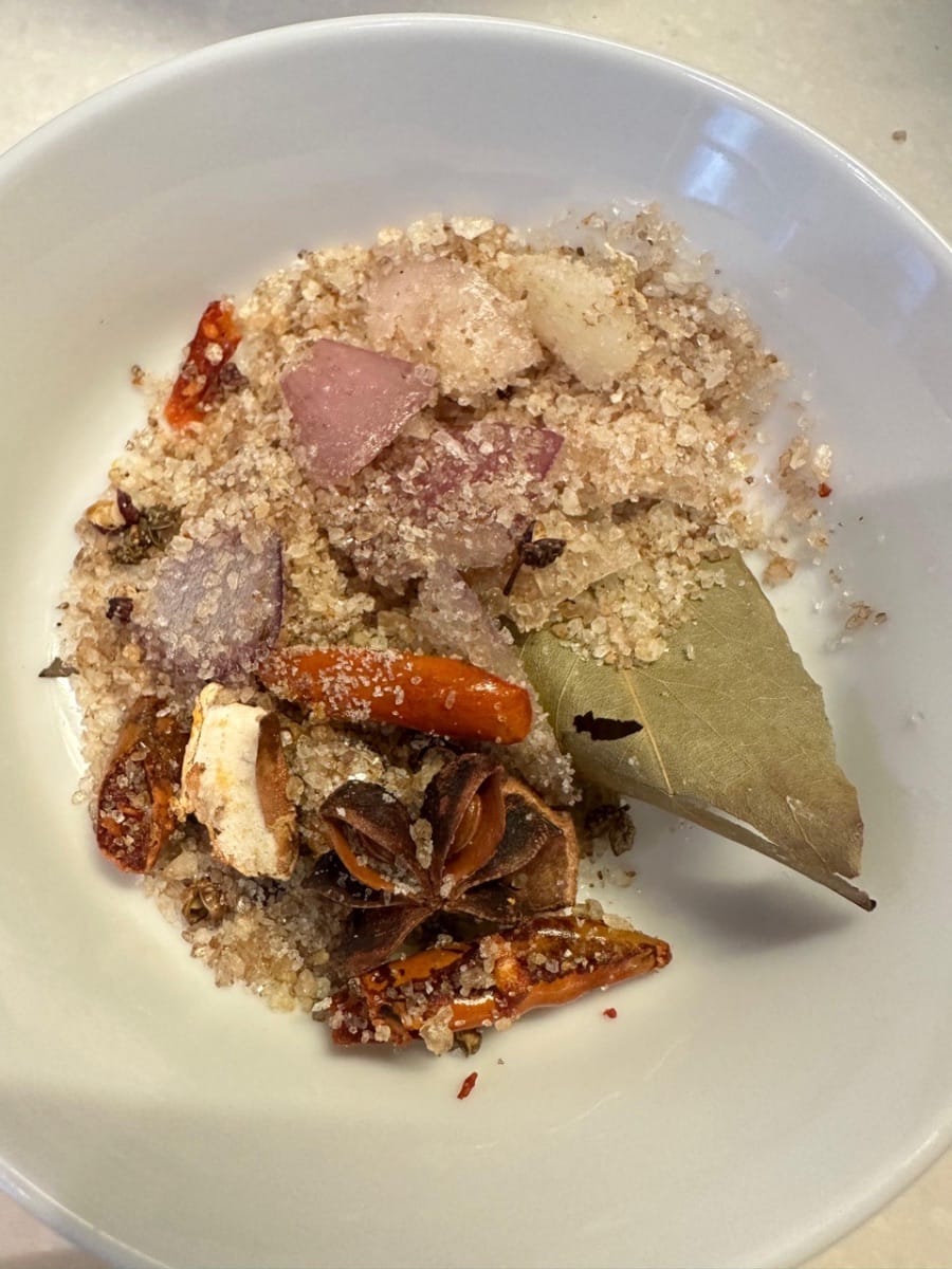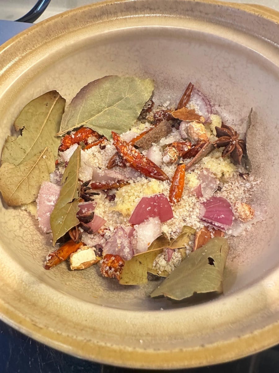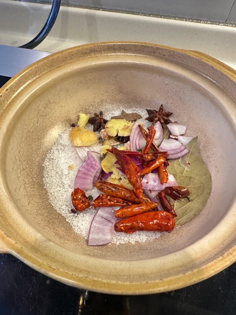 Anschließend alle Gewürze außer dem Hua Tiao-Wein zum Salz geben.