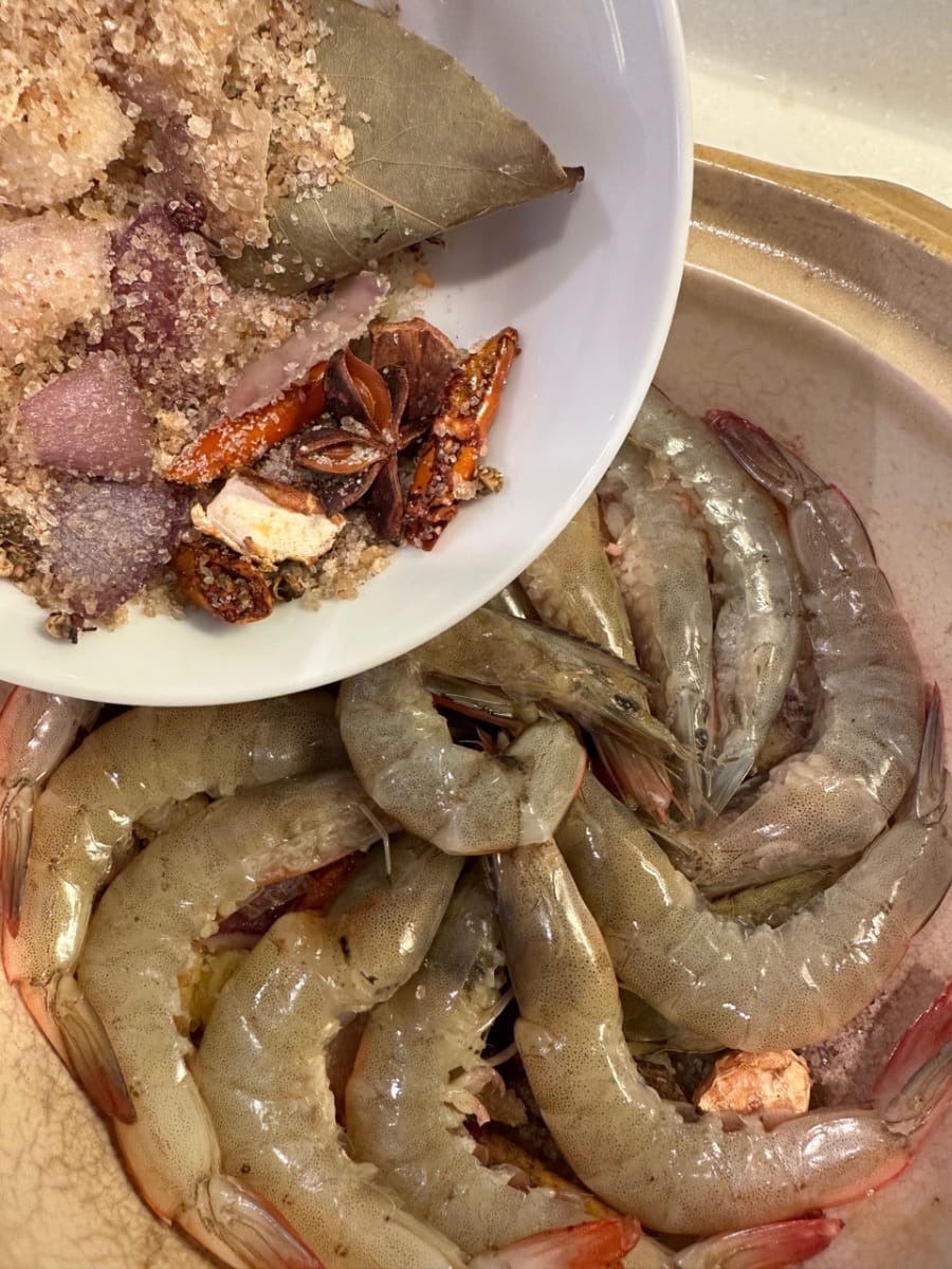 Geben Sie die Garnelen in denselben Tontopf und arrangieren Sie sie schön.