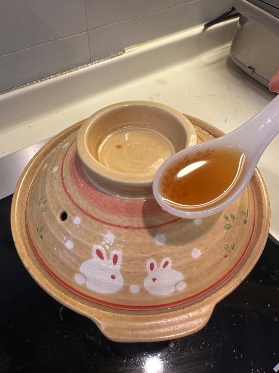 Mit einem Deckel abdecken und Hua Tiao-Wein über den Deckel gießen. 8 Minuten bei schwacher Hitze backen lassen.