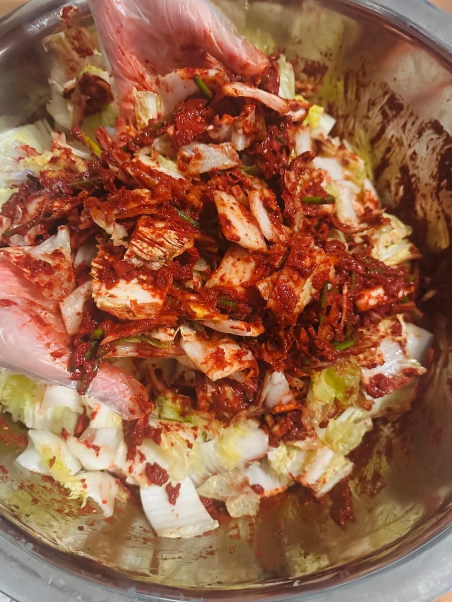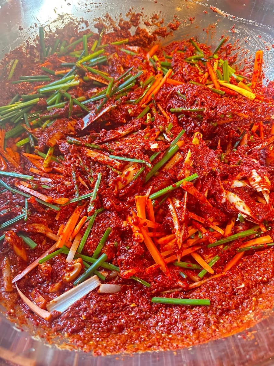- In einer großen Schüssel koreanisches Chilipulver, Klebreismischung, pürierten Saft, Lauch, Karotten, Rettich und Schnittlauchblüten vermengen.