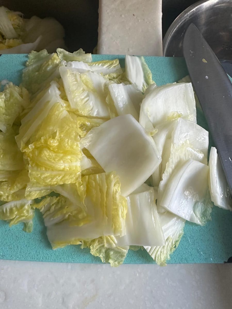 - Anschließend in Stücke schneiden und beiseite stellen.