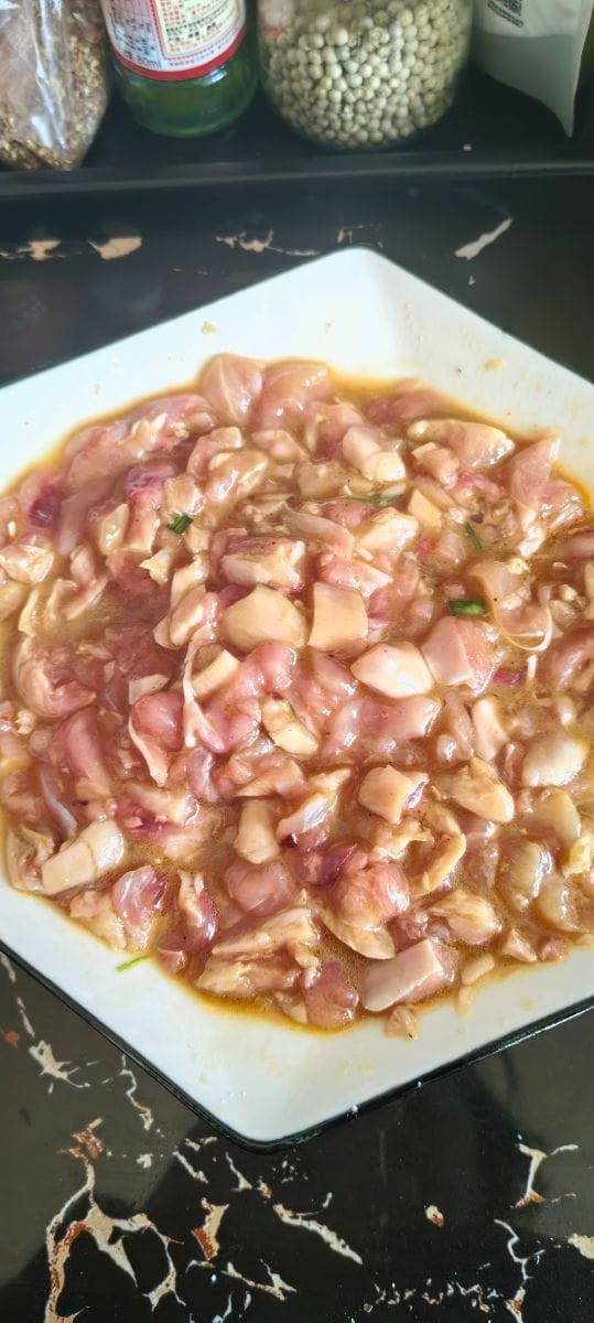 - Zuerst die Hähnchenschenkel entbeinen und in kleine Würfel schneiden.