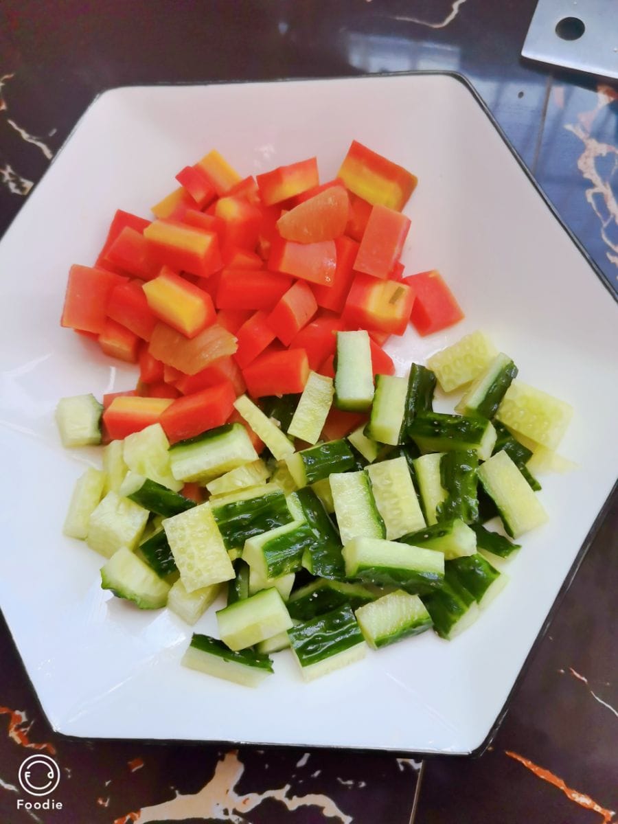 - Frühlingszwiebeln, Ingwer, Knoblauch und getrocknete Chilischoten hinzufügen, unter Rühren anbraten, bis es duftet, dann Gurke und gewürfelte Karotten dazugeben.