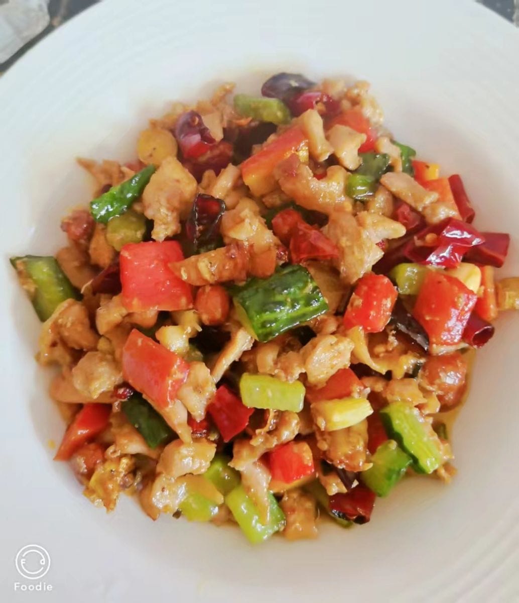 Diese Kombination der Zutaten macht Kung Pao Chicken zu einem Fest für Augen, Nase und Gaumen. Zarte Hähnchenstücke treffen auf knackige Gurken und süße Karotten, alles umhüllt von einer reichhaltigen Sauce. Garniert mit knusprigen Erdnüssen und leuchtend roten getrockneten Chilischoten, ist es herzhaft, leicht scharf und ein wenig süß – ein äußerst reichhaltiges und komplexes Geschmackserlebnis. Es passt hervorragend zu Reis!