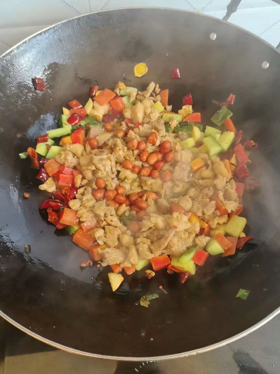 - Die zuvor angebratenen, gewürfelten Hähnchenbrustwürfel dazugeben und zum Schluss noch ein paar Erdnüsse hinzufügen.