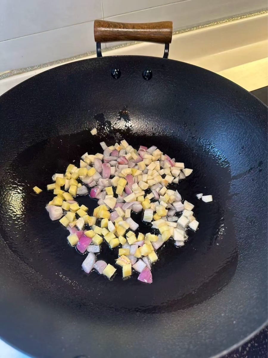 - In einer erhitzten Pfanne mit Öl Knoblauch, Ingwer und Schalotten anbraten, bis sie duften.