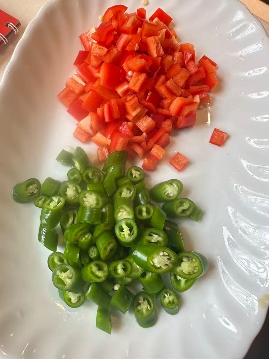 - Anschließend rote und grüne Chilischoten hinzufügen und weiter rühren, bis sie weich sind.