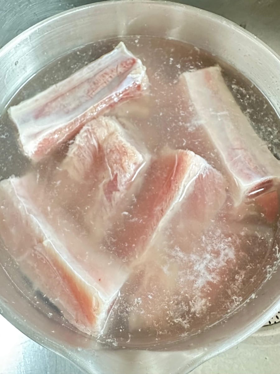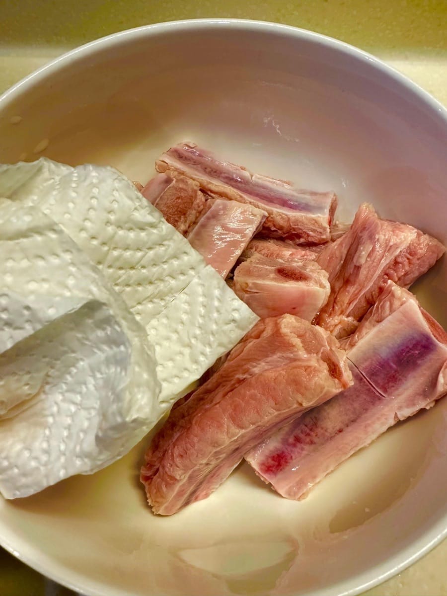 - To clean the pork ribs, rub them with corn starch and salt, and let soak for 10 minutes