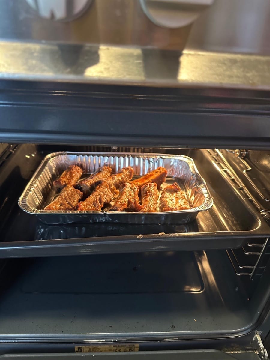 - Once the pork is done marinating, transfer onto an aluminium baking tray and spray with oil on both sides