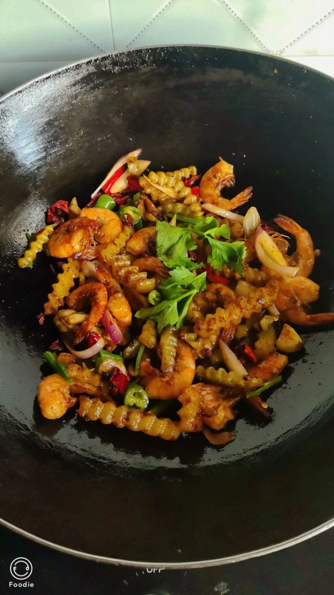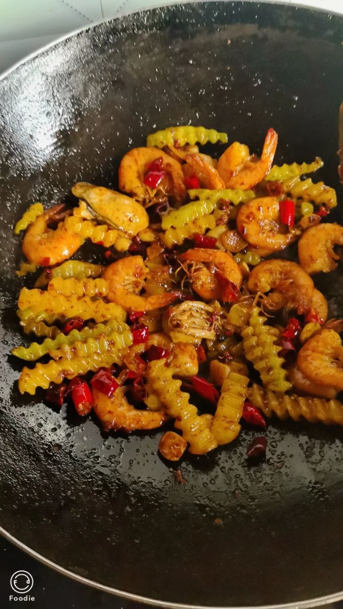 - After stir-frying until fragrant, add the shrimp and side dishes, stir-fry over high heat until the sauce is fragrant, finally sprinkle with shredded onions and celery, stir-fry again until evenly mixed, and it's ready to serve.