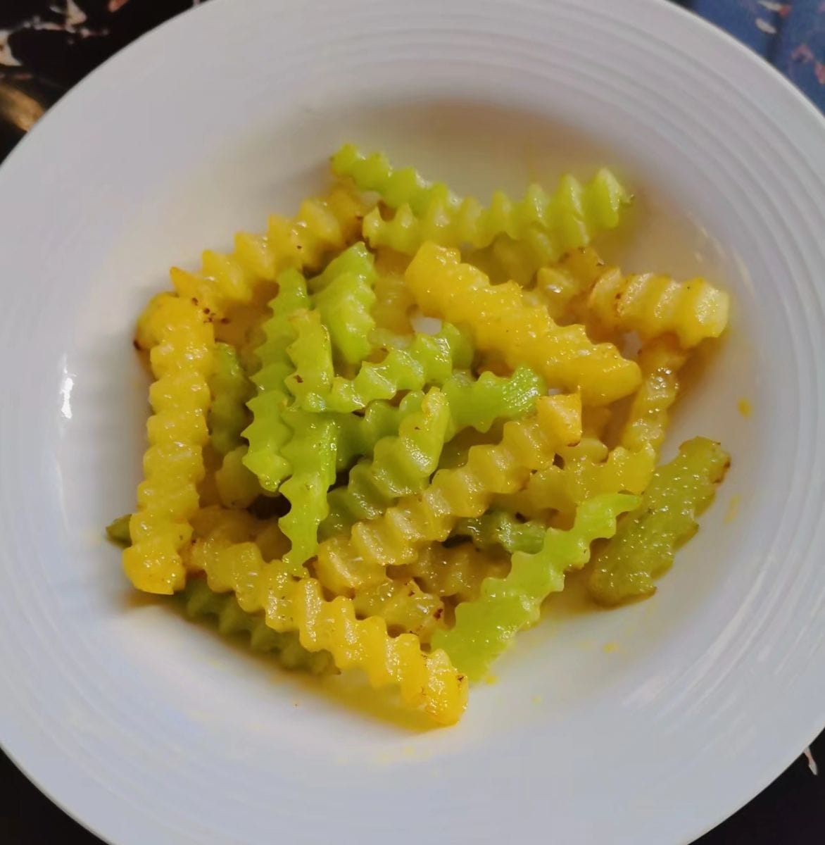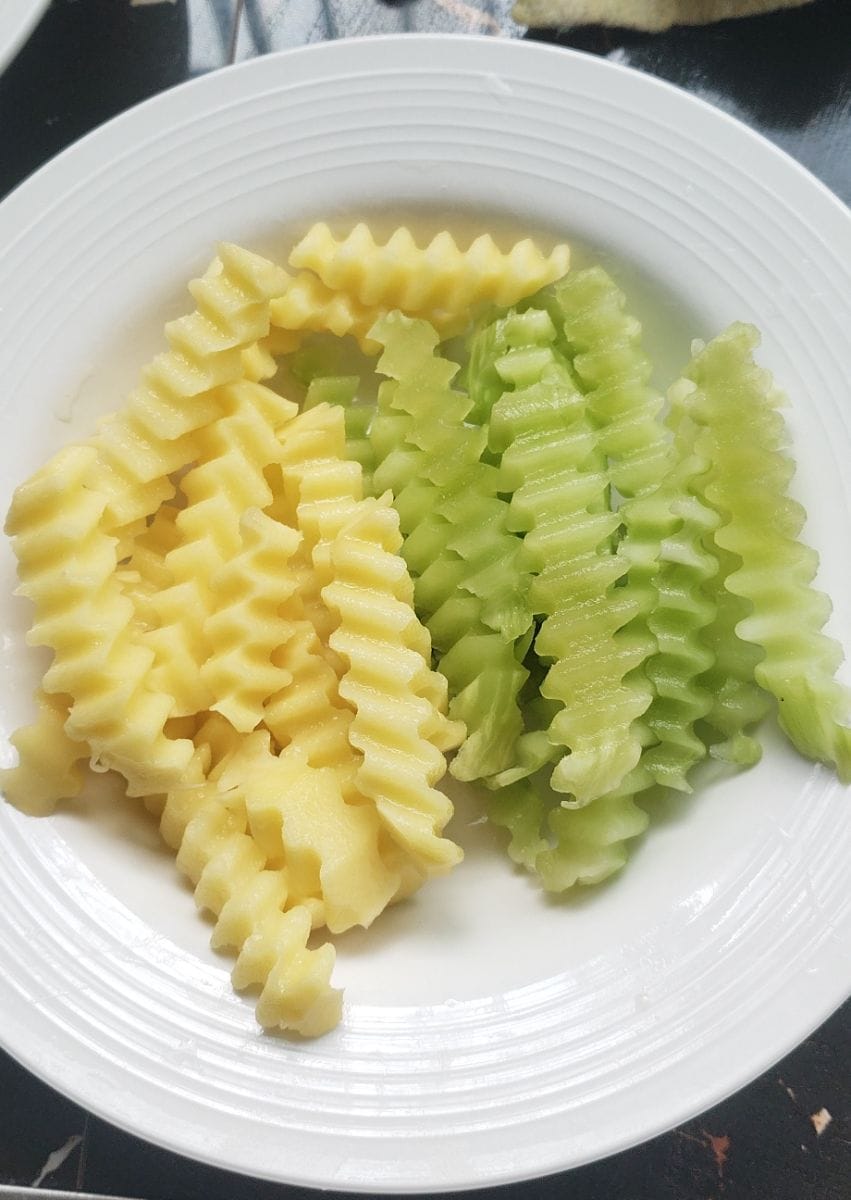 - Peel the lettuce and potatoes and cut them into thick strips using a wavy knife (or a regular knife).