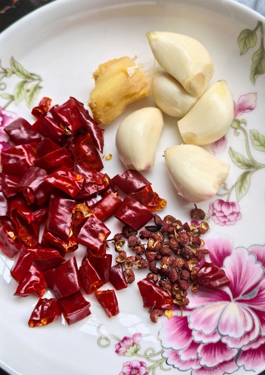 - 5 One clove of garlic and one small ginger sprout (Add more dried chilies if you like it spicy, and just a few if you don't. Also add about ten peppercorns.)