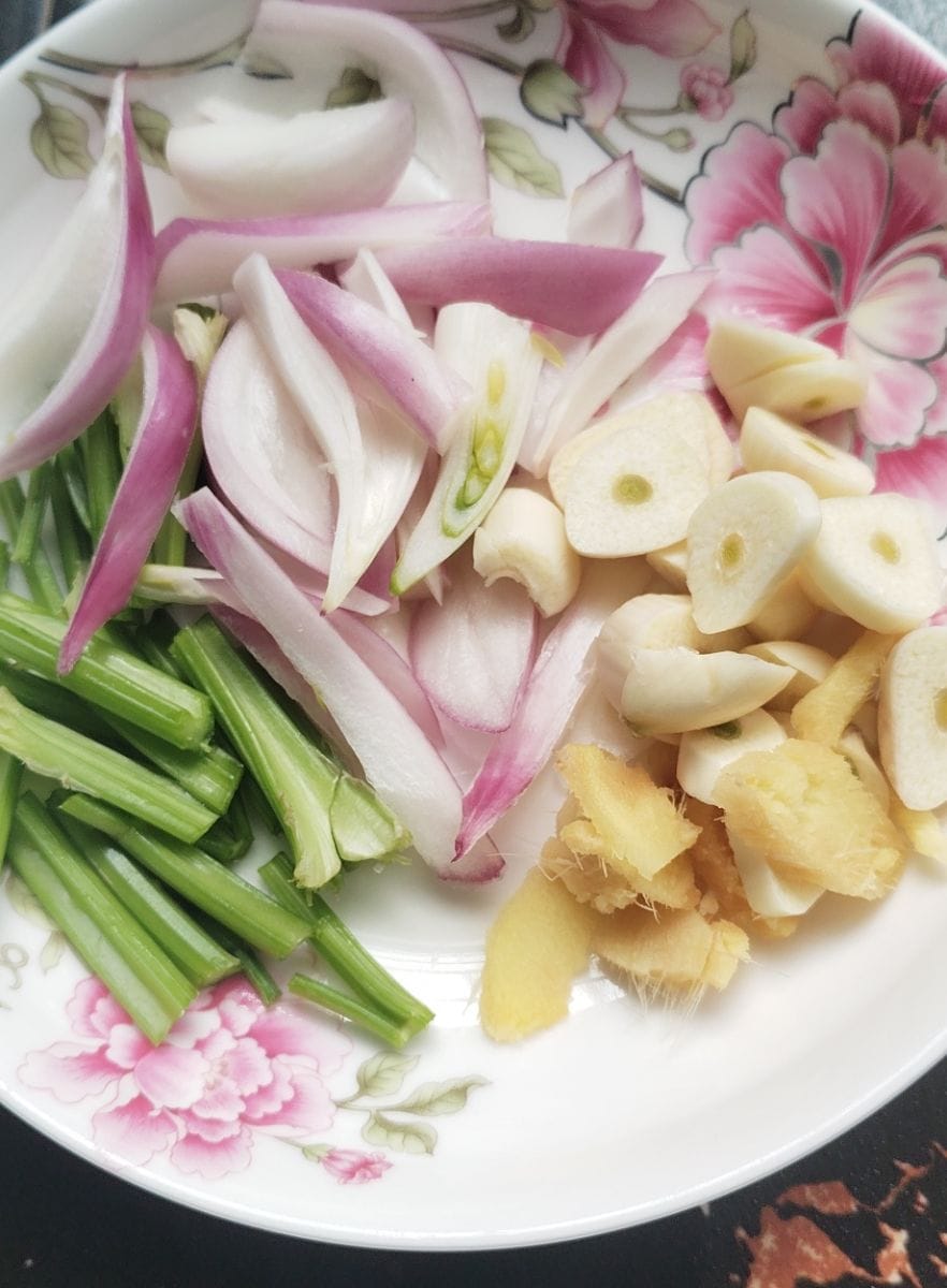 - 2 celery leaves (One green chili pepper, half an onion)