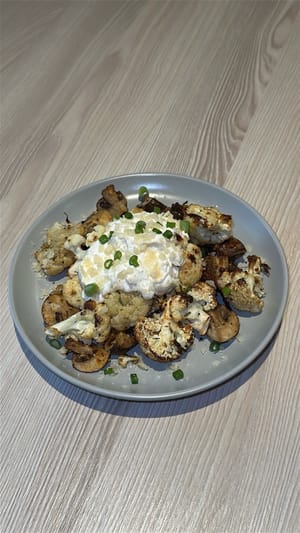 Roasted cauliflower and mushroom in oven with garlic parmesan together with a creamy yogurt sauce. Makes eating vegetables much easier!