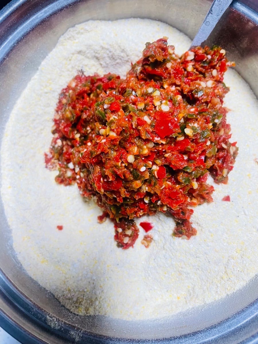 - Add 50 grams of salt to the three ground powders, mix well, then add the crushed chili peppers. Wearing gloves, mix by hand until fully combined. The flavor should be slightly saltier than usual.