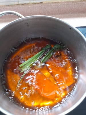 mix pandan leaves (2 pandan leaves), brown sugar (200gr) and water in a pan (250ml). Boil the brown sugar until it boils and thickens slightly. (Strain and set aside)
