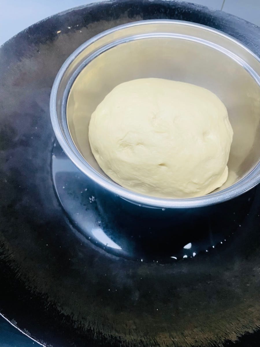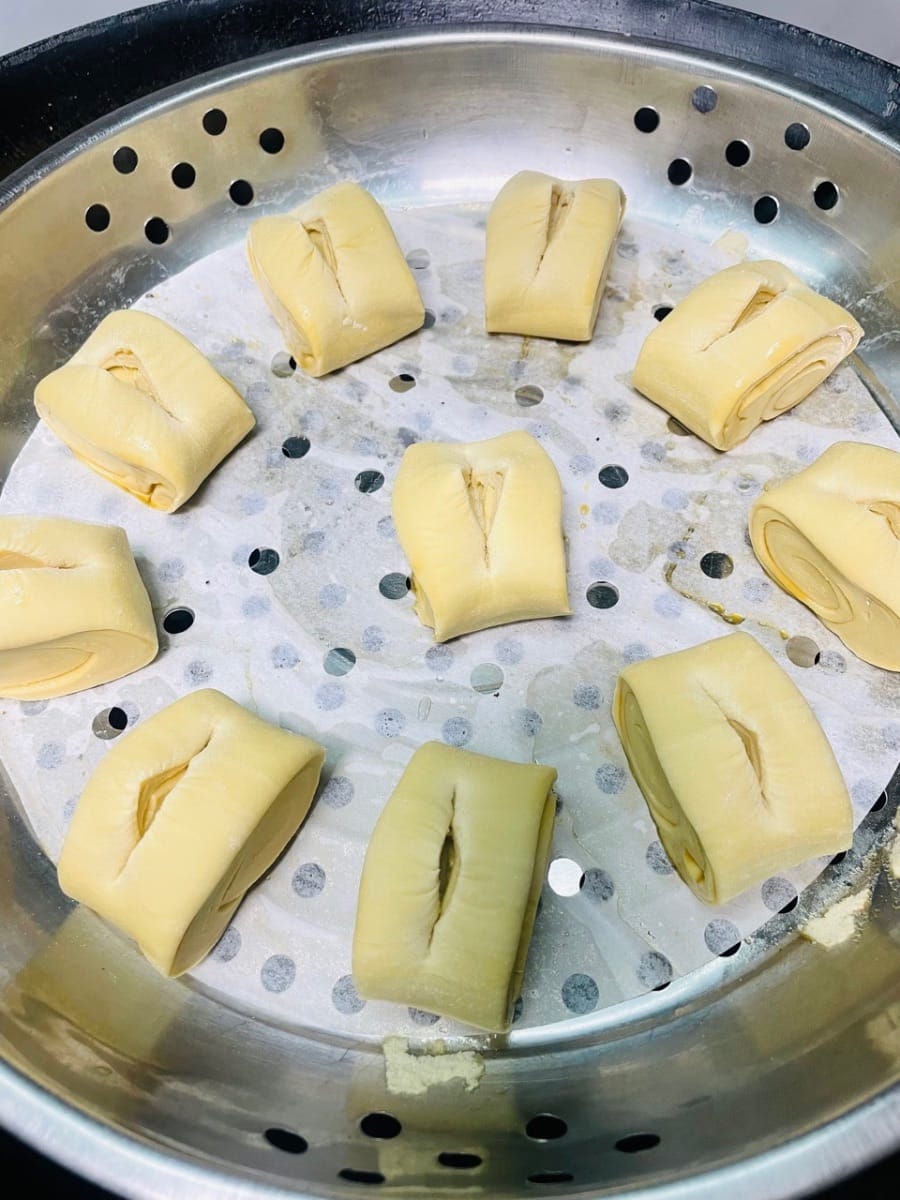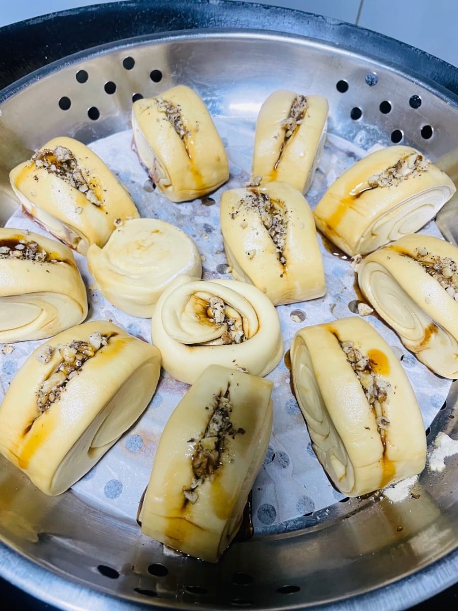 - Unte con aceite la rejilla de la vaporera o cúbrala con papel antiadherente, coloque las piezas de masa cortadas sobre ella, vierta agua caliente a unos 60 °C en la olla y deje reposar la masa durante 20 minutos. Antes de que suba, haga un corte en el centro de la masa, exprima un poco de jarabe de azúcar moreno líquido, espolvoree con nueces tostadas picadas y espere a que la masa haya subido 1,5 veces su volumen original antes de cocinarla al vapor durante 13 minutos. Después de apagar el fuego, deje reposar 5 minutos.