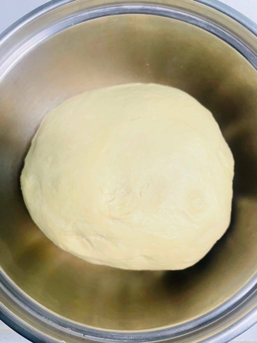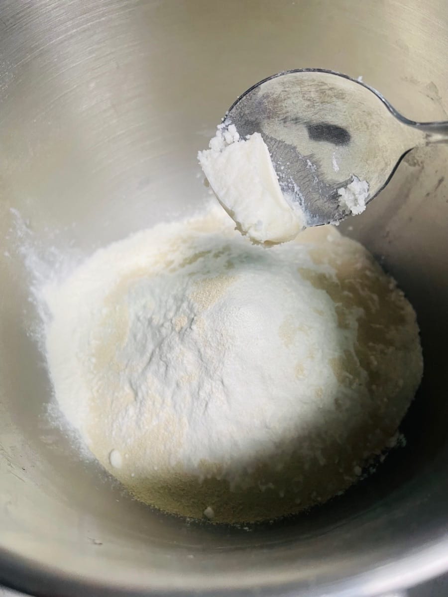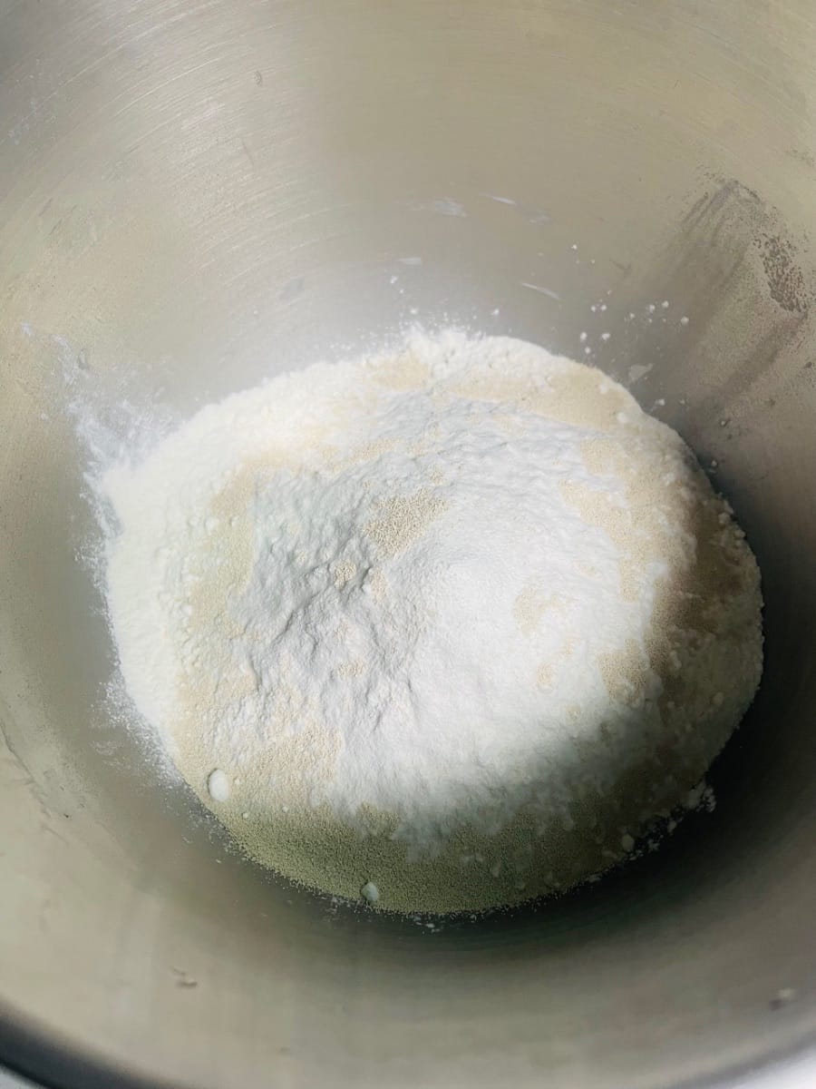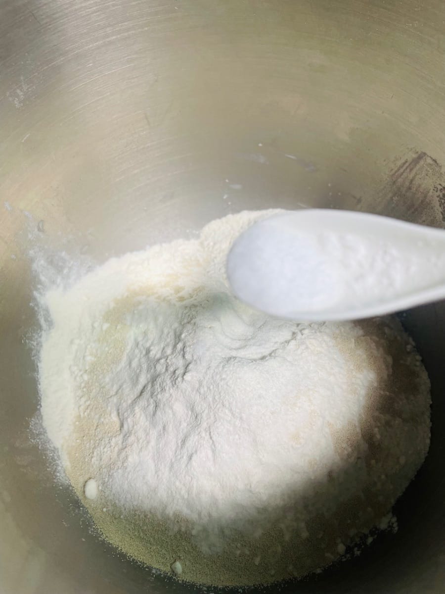 - Agregue 5 g de manteca de cerdo, 250 g de harina, 3 g de levadura y 2 g de sal al agua con azúcar morena enfriada, vierta todo en el tazón y amáselo hasta obtener una masa suave.