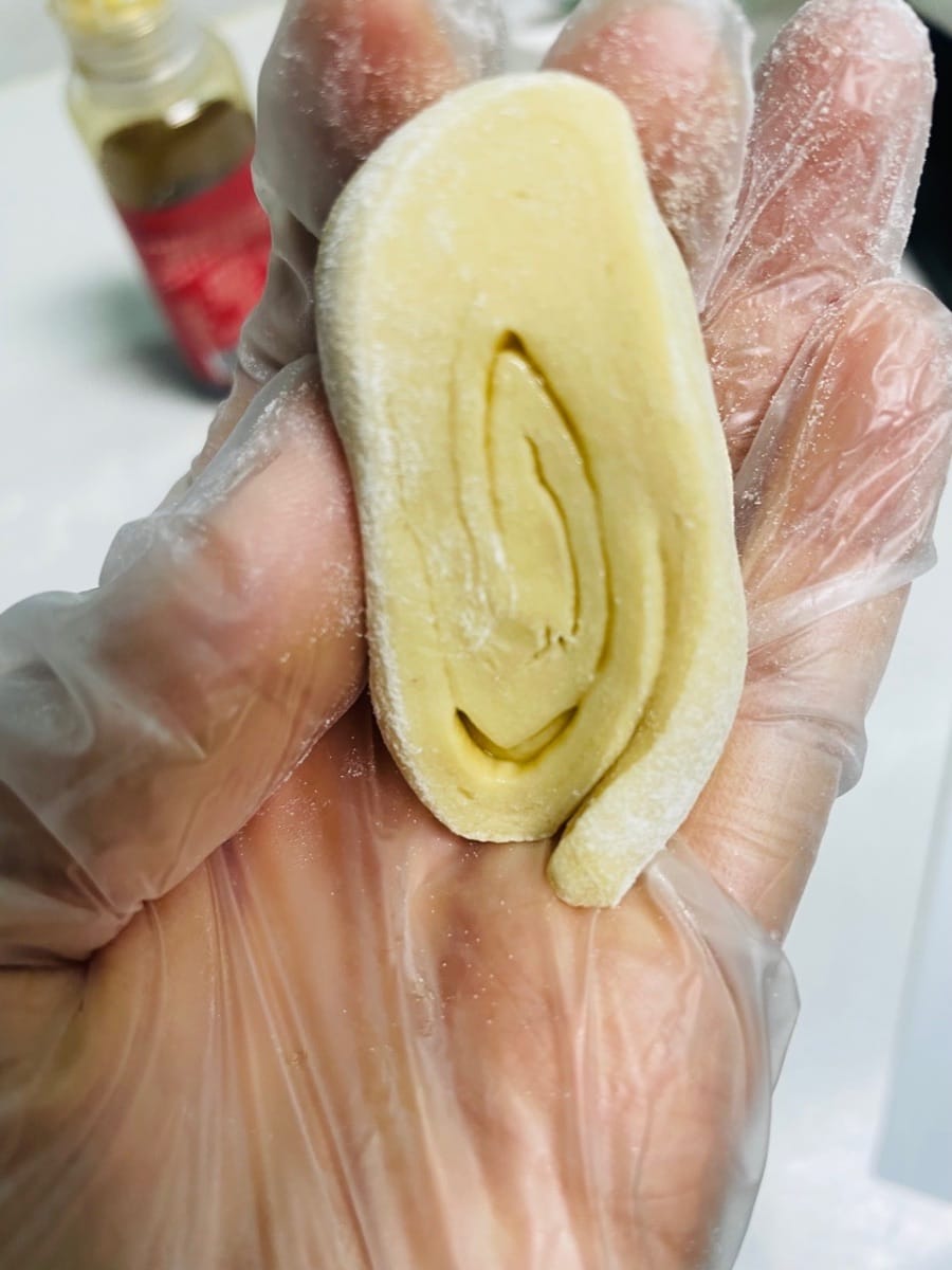 - Extender la masa amasada en una lámina fina, pincelarla con una capa de jarabe de azúcar moreno líquido, luego enrollarla firmemente, asegurándose de que no queden huecos, y luego cortarla en trozos pequeños de unos 3 cm de largo.